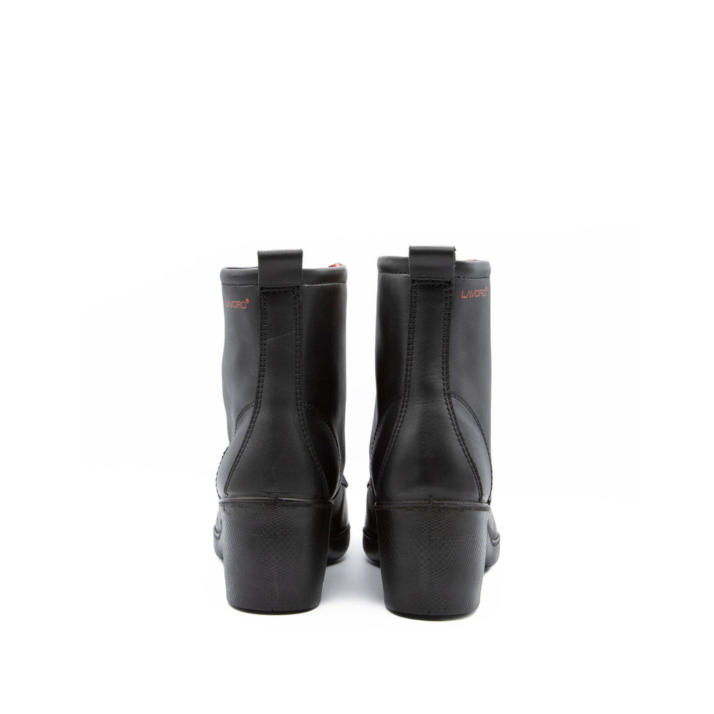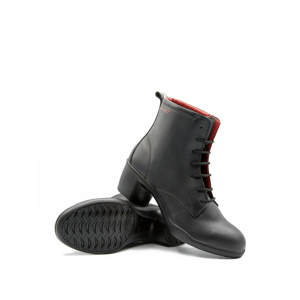Lucy a is a S3 SRC ESD protection class safety boot recognized for its comfort and durability. The details make the boot, from the abrasion resistant Direct injected PU sole to the flexible and light perforation-resistant KEVLAR midsole, a safety shoe has never felt so smart. Foot health and comfort are ensured by the Black Full Grain Leather upper, a Red Breathable Aniline Leather lining, and a Steel toe cap (impact-resistant to 200 J). Safety boot available from size 36 to 42, Lucy is the ideal boot for light industries and services, executive, eletronic services, horeca and healthcare activities.